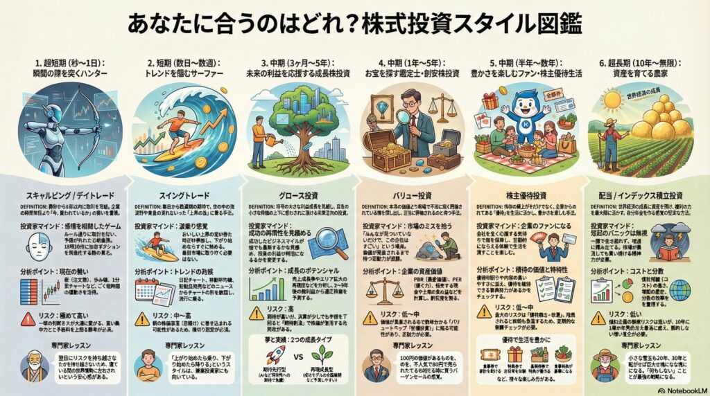 スキャルピング / デイトレ、スイングトレード、成長株(グロース)投資、割安株(バリュー)投資、株主優待生活、配当 / インデックス投資